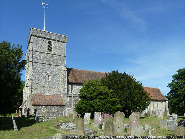 EastryEastry is, ecclesiastically, in the diocese of Canterbury, in the archdeaconry of Canterbury and in the deanery of Sandwich. The church is named for St. Mary the Blessed Virgin with registers commencing 1559. Eastry, is a a village, a parish, a district, and a hundred, in Kent. The village stands 2-1/2 miles southwest by south of Sandwich rail station; was once a market town, belonging to Canterbury priory; was previously a seat of the Saxon kings, who had a palace at it; and has now a post office with a savings banks and a money order office under Sandwich, a fair on 2 October, a church, a Wesleyan chapel, a workhouse, and charities £109. The church is chiefly early English, but has Norman portions; and contains monuments of the Botelers, the Paramors, the Harveys, and the Bargraves. The parish contains also Heronden, Selson, Gower, Statenborough, and Falderland. Acres, 2,715. Real property in 1860, £7,870. Population in 1861, 1,505. Houses, 236. The property is subdivided. Court Lodge belonged to the Bargraves, and was the hiding place of Becket, for some days, before his flight to France. Some ancient remains are at Statenborough; and a remarkable excavation, winding to a great depth through chalk strata, is in the vicinity of Eastry village. The living is a vicarage in the diocese of Canterbury. Value, £310 with a habitable glebe house. Patron, the Archbishop of Canterbury. The district comprehends the sub-district of Sandwich, containing the parishes of Sandwich St. Mary, Sandwich St. Peter, Sandwich St. Clement, Ash-next-Sandwich, Woodnesborough, Worth, Ham, Eastry and Betshanger, the extra-parochial tract of St. Bartholomews Hospital, and most of the parish of Northbourne; the sub-district of Wingham containing the parishes of Wingham, Elmstone, Goodnestone, Stourmouth, Staple-next-Wingham; Preston-by-Wingham, and a small part of Northbourne; the sub-district of Eythorn, containing the parishes of Eythorn, Tilmanstone, Nonington, Chillenden, Knowlton, Barfreston, and the larger part of Waldershare; and the sub-district of Deal, containing the parishes of Deal, Walmer, Shoulden, Ripple, Little Mongeham, Great Mongeham, Sutton-by-Dover and the smaller part of Waldershare. Acres, 50,710. Poor rates in 1862, £14,378. Population in 1851, 25,162; in 1861, 25,900. Marriages in 1860, 203; births, 745 of which 51 were illegitimate; deaths, 472 of which 137 were at ages under 5 years and 30 at ages above 85. Marriages in the ten years 1851-1860, 1,830; births, 7,815; deaths, 4,968. The places of worship in 1851 were 34 of the Church of England, with 11,527 sittings; 6 of Independents, with 1,744 sittings; 4 of Baptists, with 1,352 sittings; 7 of Wesleyan Methodists, with 1,064 sittings; 1 of Primitive Methodists, with 130 sittings; 4 undefined, with 450 sittings; and 1 of Roman Catholics, with 300 sittings. The schools were 21 public day schools with 2,008 scholars; 83 private day schools, with 1,626 scholars; and 35 Sunday schools, with 2,666 scholars. The hundred is in the lathe of St. Augustine; is bounded by the Straits of Dover on the east, and by the river Stour on the north; and contains twelve parishes. Acres 19,677. Population in 1861, 4,525. Houses, 794. Heronden, a hamlet in Eastry parish, Kent; 1/2 a mile southwest of Eastry. Hereonden Hall is the seat of W. Whelan. Selson, a hamlet in Eastry parish, Kent; 5 miles northwest of Deal. Gower, a hamlet in Eastry parish, Kent. Statenborough, a hamlet in Eastry parish, Kent; near Eastry. Source: John Marius Wilson, comp. The Imperial Gazatteer of England and Wales. (London, England: A. Fullerton & Co., 1870). Eastry Bibliography-- various. 'Archaeologia Cantiana'. Publisher: Kent, England: Kent Archaeological Society, various dates. [Note: The following volumes can be found on archive.org: 1, 2, 3, 4, 5, 6, 7, 8, 9, 10 (1876), 11, 12, 13 (1880), 14, 15, 16, 17, 18, 19, 20, 21, 22, 23, 24, 25, 26, 27, 32, 34, 35, vol. 1907 supplement.]