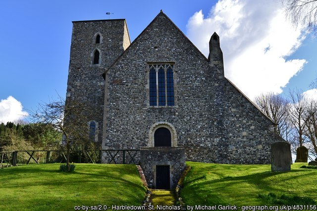 HarbledownHarbledown is, ecclesiastically, in the diocese of Canterbury, in the archdeaconry of Canterbury and in the deanery of Canterbury. The church is named for St. Nicholas with registers commencing 1557. Harbledown, a village and a parish in Bridge district, Kent. The village stands near the London, Chatham and Dover railway, 1 mile west of Canterbury; and has a post office under Canterbury. It grew around a lazar-house, founded, in 1084, by Archbishop Lanfranc; and it is "the little town" of Chaucer "which that yeleped is Bob up and down, Under the Blee, in Canterbury way." The parish includes also the hamlet of Rough Common. Acres, 1,670. Real property in 1860, £4,826. Population in 1861, 655. Houses, 145. The lazar-house adjacent to the village was for lepers, and consisted originally of several wooden structures; was refounded, by Edward VI., for the residence and maintenance of 26 poor men and women; was rebuilt, with the exception of its church, in the time of James I.; consists now of a range of cottages and gardens, with central large common hall; bears the name of St. Nicholas' hospital; and has an endowed income of £223. An excellent spring adjacent to it bears the name of the Black Prince's well, from a tradition that the water of it was sent to the Black Prince during a severe illness; and it may have occasioned the selection of the site for the hospital, on account of its reputed virtues. The upper leather of a shoe of Thomas à Becket, with a crystal set in it, was possessed by the hospital before the Reformation; and, when pilgrims to Canterbury were passing by, this was usually brought forth by one of the inmates to the steps leading down to the road, and presented, with much reverence, to the better class of pilgrims, to be devoutly kissed as a sacred relic. A ludicrous account of the performance is given by Erasmus in his "Peregrinatio". A maple bowl, figured with Guy of Warwick's killing the dragon, and set with a large crystal, is preserved in a chest in the common hall; and the crystal on it is supposed to be that which was formerly on Becket’s shoe. The church of the hospital is partly Norman, partly early English; consists of nave, aisles, and chancel, with western ivy-clad tower; and contains a curious ancient stone font, and some remains of ancient frescoes. A farm on which the hospital stands, together with the hospital itself, is exempt from the jurisdiction of the parish, and belongs to Canterbury. The parochial living is a rectory in the diocese of Canterbury. Value £383 with a habitable glebe house. Patron, the Archbishop of Canterbury. The church is ancient; consists of nave and chancel, with a small tower; and was recently enlarged and improved. Rough Common, a hamlet in Harbledown parish, Kent; near Canterbury. Source: John Marius Wilson, comp. The Imperial Gazatteer of England and Wales. (London, England: A. Fullerton & Co., 1870). Harbledown Bibliography-- various. 'Archaeologia Cantiana'. Publisher: Kent, England: Kent Archaeological Society, various dates. [Note: The following volumes can be found on archive.org: 1, 2, 3, 4, 5, 6, 7, 8, 9, 10 (1876), 11, 12, 13 (1880), 14, 15, 16, 17, 18, 19, 20, 21, 22, 23, 24, 25, 26, 27, 32, 34, 35, vol. 1907 supplement.]