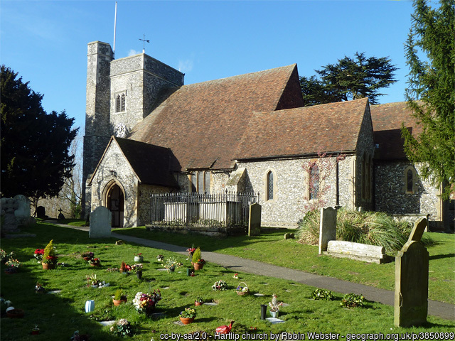 HartlipHartlip is, ecclesiastically, in the diocese of Canterbury, in the archdeaconry of Canterbury and in the deanery of Sittingbourne. The church is named St. Michael & All Angels with registers commencing 1538. Hartlip, is a village and a parish in Milton district, Kent. The village stands near Watling street and the North Kent railway, 2 miles southeast of Rainham rail station, and 5-1/2 east south east of Chatham; and has a post office under Sittingbourne. The parish comprises 1,412 acres. Real property in 1860, £2,723. Population in 1861, 319. Houses, 67. The property is divided among a few. Remains of Roman baths, attached to a Roman villa, in a field called Lower Danefield, were discovered about 1750, and laid open in 1848; and, at their first discovery, were found to contain many bushels of wheat, apparently scorched by fire. The living is a vicarage in the diocese of Canterbury. Value, £210 with a habitable glebe house. Patrons, the Dean and Chapter of Rochester. The church is cruciform, and of the latter part of the 13th century; has a square Norman tower; was restored in 1865; and contains a handsome font. There are a chapel for Bible Christians, and an endowed school, rebuilt in 1855. Source: John Marius Wilson, comp. The Imperial Gazatteer of England and Wales. (London, England: A. Fullerton & Co., 1870). Hartlip Bibliography-- various. 'Archaeologia Cantiana'. Publisher: Kent, England: Kent Archaeological Society, various dates. [Note: The following volumes can be found on archive.org: 1, 2, 3, 4, 5, 6, 7, 8, 9, 10 (1876), 11, 12, 13 (1880), 14, 15, 16, 17, 18, 19, 20, 21, 22, 23, 24, 25, 26, 27, 32, 34, 35, vol. 1907 supplement.]