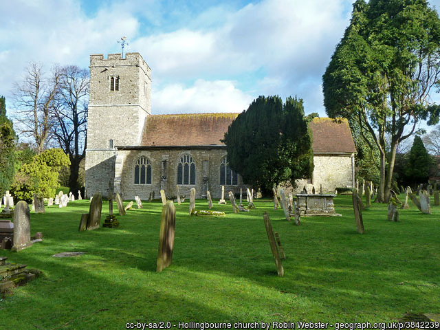 HollingbourneHollingbourne is, ecclesiastically, in the diocese of Canterbury, in the archdeaconry of Maidstone, and in the deanery of Sutton. The church is named All Saints with original parish registers commencing 1556. Hollingbourne, a village, a parish, a sub-district, and a district in Kent. The village stands 5-1/2 miles east of Maidstone rail station; was known at Domesday as Hoilingeborde; and has a post office under Maidstone, and a fair on 16 June. The parish contains also the hamlet of Eyhorne Street, and the places called New Englands, Woodcut Hill and Greenway Court. Acres, 4,560. Real property in 1860, £,6,108. Population in 1851, 1,302; in 1861 1,190. Houses, 189. The decrease of population arose from emigration, caused by want of employment. Most of the property is divided among seven. The manor belongs to the Dean and Chapter of Canterbury. There were formerly paper mills; and these were converted into flour mills. There are brick and tile works. Very curious relics, of unique character, supposed to be Roman, and including a wooden club scarcely 2 feet long and a small wooden sword or dagger, were found about 3-1/2 feet below the surface, during the enlargement of a mill pond, in 1862. The living is a vicarage, united with the vicarage of Hucking, in the diocese of Canterbury. Value, £430, with a habitable glebe house. Patron, the Archbishop of Canterbury. The church is early and later English; consists of nave, aisles, and chancel, with low square tower; and contains many monuments of the Culpepers, of the 17th and 18th centuries. There are an endowed national school, a charity for widows with £100 a year, and other charities with £22. The district workhouse is in the parish; and, at the census of 1861, had 241 inmates. The sub-district contains also the parishes of Boxley, Detling, Bredhurst, Stockbury, Thurnham, Hucking, Bicknor and Wormshill. Acres, 22,026. Population in 1861, 4,690. Houses, 878. The district comprehends also the sub-district of Lenham, containing the parishes of Lenham, Boughton Malherbe, Harrietsham, Frinsted, Witchling, and Otterden;and the sub-district of Headcorn, containing the parishes of Headcorn, Ulcombe, Broomfield, Leeds, Langley, Sutton Valence, East Sutton and Chart next Sutton Valence. Acres, 57,017. Poor rates in 1863, £10,721. Population in 1851, 13,751; in 1861, 13,584. Houses, 2,743. Marriages in 1862, 74; births, 434 of which 34 were illegitimate; deaths, 206 of which 66 were at ages under 5 years and 6 at ages above 85. Marriages in the ten years 1851-1860, 780; births, 4,470; deaths, 2,552. The places of worship in 1851 in the district were 23 of the Church of England, with 5,487 sittings; 5 of Independents, with 1,038 sittings; 2 of Baptists, with 240 sittings; 6 of Wesleyan Methodists, with 719 sittings; 1 of Primitive Methodists, with 70 sittings; and 1 of Bible Christians, with 90 sittings. The schools were 16 public day schools, with 1,220 scholars; 25 private day schools, with 554 scholars; 21 Sunday schools with 1,206 scholars; and 1 evening school for adults, with 12 scholars. Source: John Marius Wilson, comp. The Imperial Gazatteer of England and Wales. (London, England: A. Fullerton & Co., 1870). Hollingbourne Bibliography-- various. 'Archaeologia Cantiana'. Publisher: Kent, England: Kent Archaeological Society, various dates. [Note: The following volumes can be found on archive.org: 1, 2, 3, 4, 5, 6, 7, 8, 9, 10 (1876), 11, 12, 13 (1880), 14, 15, 16, 17, 18, 19, 20, 21, 22, 23, 24, 25, 26, 27, 32, 34, 35, vol. 1907 supplement.]
