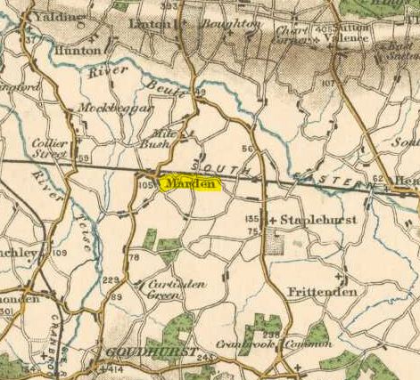 MardenMarden is a village, a parish, a sub-district, and a hundred in Kent. The village stands near an affluent of the river Medway, and on the Reigate, Tunbridge and Ashford railway, 3 miles west-north-west of Staplehurst; is a picturesque place; was formerly a market town; and has a post office under Staplehurst, a money order office and a savings bank, a railway station with telegraph, and a fair on 10 October. The parish contains also the hamlet of Stile Bridge. Acres, 7,607. Real property in 1860, £11,652. Population in 1861, 2,295. Houses, 452. The property is much subdivided. The manor belongs to R. Springett, Esq.. The living is a vicarage in the diocese of Canterbury. Value, £828 with a habitable glebe house. Patron, the Archbishop of Canterbury. The church is ancient but good; consists of nave, aisles, and chancel, with a tower; and contains a very curious font of 1652. There are chapels for Independents and Wesleyans, parochial schools, a Church of England school, and charities of £55. The parochial schools were built in 1859, at a cost of about £1,600; and are a handsome structure, in the Tudor style. Amhurst, the author of the "Craftsman", was a native. The sub-district contains also two other parishes, and part of another; and is in Maidstone district. Acres 15,317. Population in 1861, 4,905. Houses 906. The hundred excludes one of the parishes and the part parish of the sub-district, but includes another and larger parish; and is in the lathe of Scray. Acres, 23,029. Population in 1851, 6,550. Houses, 1,227. Stile Bridge pp.is a hamlet in Marden parish; on the river Beult, 3 miles northwest of Staplehurst. It has a post office under Staplehurst.1 A great deal of records are also becoming available via the Marden Village Society History Group. See the record categories below for links to some of the research data on that web site. The Marden Society has an online archive of their journal, the "Parish Pump".1John Marius Wilson, comp. The Imperial Gazatteer of England and Wales. (London, England: A. Fullerton & Co., 1870). 2Edward Hasted, ed. and comp. The town and parish of Marden: Town and manors, The History and Topographical Survey of the County of Kent: Volume 9 (1798), pp. 291-299. Marden Bibliography-- various. 'Archaeologia Cantiana'. Publisher: Kent, England: Kent Archaeological Society, various dates. Volumes 1 through 139 are available to view free on the Kent Archaeological Society website.  [Note: The following volumes can be found on archive.org: 1, 2, 3, 4, 5, 6, 7, 8, 9, 10 (1876), 11, 12, 13 (1880), 14, 15, 16, 17, 18, 19, 20, 21, 22, 23, 24, 25, 26, 27, 32, 34, 35, vol. 1907 supplement.]