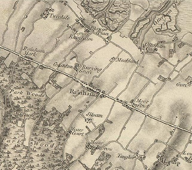 RainhamRainham is a village and a parish in Milton district, Kent. The village stands near the London, Chatham, and Dover railway, 4 miles east-south-east of Chatham. The parish extends to the Medway1. In 1821 there were 164 dwellings in the parish of Rainham; and at the same period, when the last census of the population was taken by order of Parliament, the numbers of inhabitants were as follow: males 505, females 525, making a total of 1,030 souls4. Real property as of 1860, £6,671. Population in 1861, 1,422. The increase in population over 1851 arose from the sale of freehold land for the erection of houses. The manor belongs to Sir R. Tufton, Bart.. Berengrove House is the seat of W. Walter, Esq..1 Called in ancient deeds Renham, this parish lies the next parish northward from Bredhurst, and the next eastward from Gillingham2. The whole of this parish is in the division of East Kent, which begins here, the adjoining parish of Gillingham westward, being wholly in that of West Kent. Rainham's situation is for the most part low and unpleasant, and from its nearness and exposure to the marshes very unhealthy, it contains upwards of 2,100 acres of land, beside woods, which are about five hundred and forty acres. The high road from London to Dover leads through it, on which, at a little more than the thirty-fourth mile stone from London, is the village called Rainham-street, having the church, with the parsonage and vicarage at the east end of it; there is also a neat modern-built house, belonging to John Russell, Esq. of Greenwich, and about a quarter of a mile further eastward on the road, the hamlet of Moore-street2, 4. From the high road the ground rises southward to a dreary barren country among the woods, which is exceeding hilly, the soil at places chalky and much covered with flints, over which it extends till it joins Bredhurst, its southern boundary. About the street, and northward of it, where the country lies more flat and even, though declining to that aspect, the soil too changes, and becomes a fertile and kindly land both for corn and fruit, insomuch that this parish has been noted for growing some of the best wheat that this kingdom has produced; and it had will within memory many plantations of cherries and apples, especially on the lands adjoining the high road, and to the northward of it, but the greatest part of them have been displanted some years since2. About a mile below the street north-westward, situated on the road leading from Chatham through Gillingham and this parish to King's Ferry and the Isle of Sheppey, is the hamlet of West, or Lower Rainham-street. At a less distance eastward the estate of Mackland, belonging to the charity of the chest at Chatham, the present lessee of which is Mrs. Nash2. At a small distance below the last-mentioned road are the fresh marshes, and beyond the wall which incloses them a quantity of salts, the northern boundary of which, and of this parish, is Otterham creek, which joins the Medway at each end of it. In the return of the survey made of the several places in this county, where there were any shipping, boats, etc. by order of Queen Elizabeth, in her 8th year, Rainham is said to contain houses inhabited eight, and three quays, the common quay, Blower's quay, belonging to John Tufton the younger, and Hastings quay, belonging to Henry Laurence, and the heirs of Jeffry Empson; ships and boats thirteen, from one up to thirty-five tons, and persons occupied in carrying from port to port twelve2, 4. In King Henry VIth.'s reign Sir John Pashley resided at Rainham, he married the widow of John Beausitz, of the adjoining parish of Gillingham. The family of Norden resided in this parish for some generations, one of whom John Norden, died in 1580, and lies buried in the chancel of this church, their arms were formerly painted in the windows, and now remain at each corner of his grave-stone in brass2. In the 14th year of King Edward II there were commissioners assigned to take a view of the banks and ditches lying on the banks of the Medway, near Rainham, which had received much decay from the fresh waters, and again, anno 50 Edward III others were assigned for the view of those situated in Moteneye marsh, at the manor called Quenes-court, and to proceed according to the law and custom of the realm [see Dugdale's History of Embanking, p. 42, 45.]2. The living is a vicarage in the diocese of Canterbury. Value, £520 with a habitable glebe house. Patron, the Archbishop of Canterbury. The church is partly of the 12th century; has a nave, a north aisle, and two chancels; and contains a carved rood-screen, three stone sedilia, and monuments of the Tuftons. The burial vaults of the Earls of Thanet are beneath the north chancel1. The church, which is dedicated to St. Margaret, is a handsome building, consisting of two very broad isles, and two chancels, with a high beacon tower at the west end of it, in which are six bells and a clock. There was formerly some good painted glass in the windows of this church, all which has been long since destroyed. On October 20, 1791, the steeple was greatly damaged by a storm of thunder, the lightning of which split the wall of it for several feet in length2. Historically, Robert de Crevequer, the founder of Leeds-abbey, about the year 1137, gave to the canons there, in free and perpetual alms, all the churches of his estates, with the advowsons of them, and among them that of Renham [sic: Rainham], with eighteen acres of land in that parish, which gift was made in the presence of William, archbishop of Canterbury, and John, bishop of Rochester [See the confirmations of it in Dugd. Mon. vol. ii. p. 110.]. It was at the latter end of King Edward the IIId.'s reign, appropriated to that priory, and the parsonage of it was valued in 1384, anno 8 King Richard II at £26. 15s. 4d. which, with the advowson, continued part of the possessions of the priory till the dissolution of it in the reign of Henry VIII when 